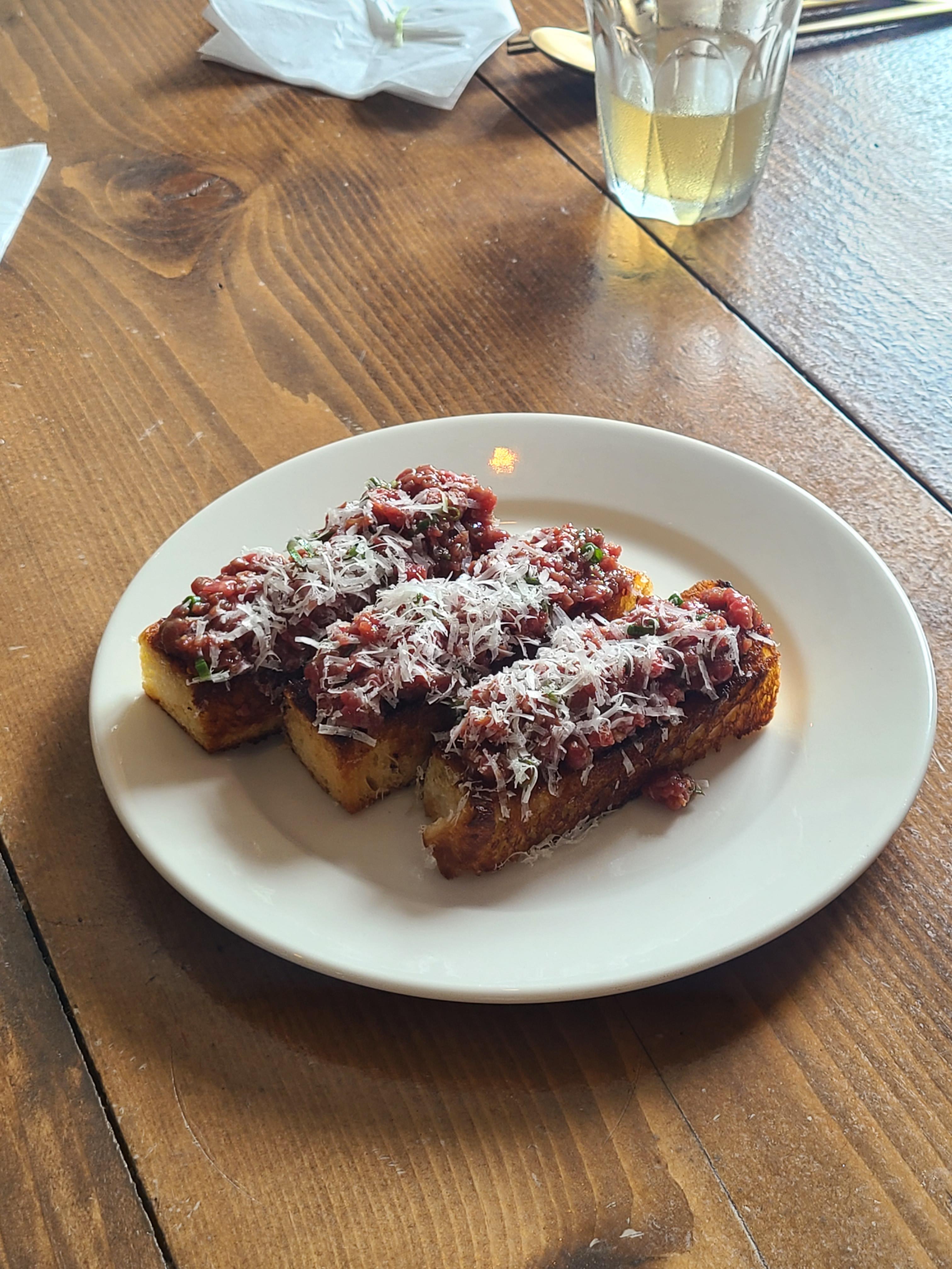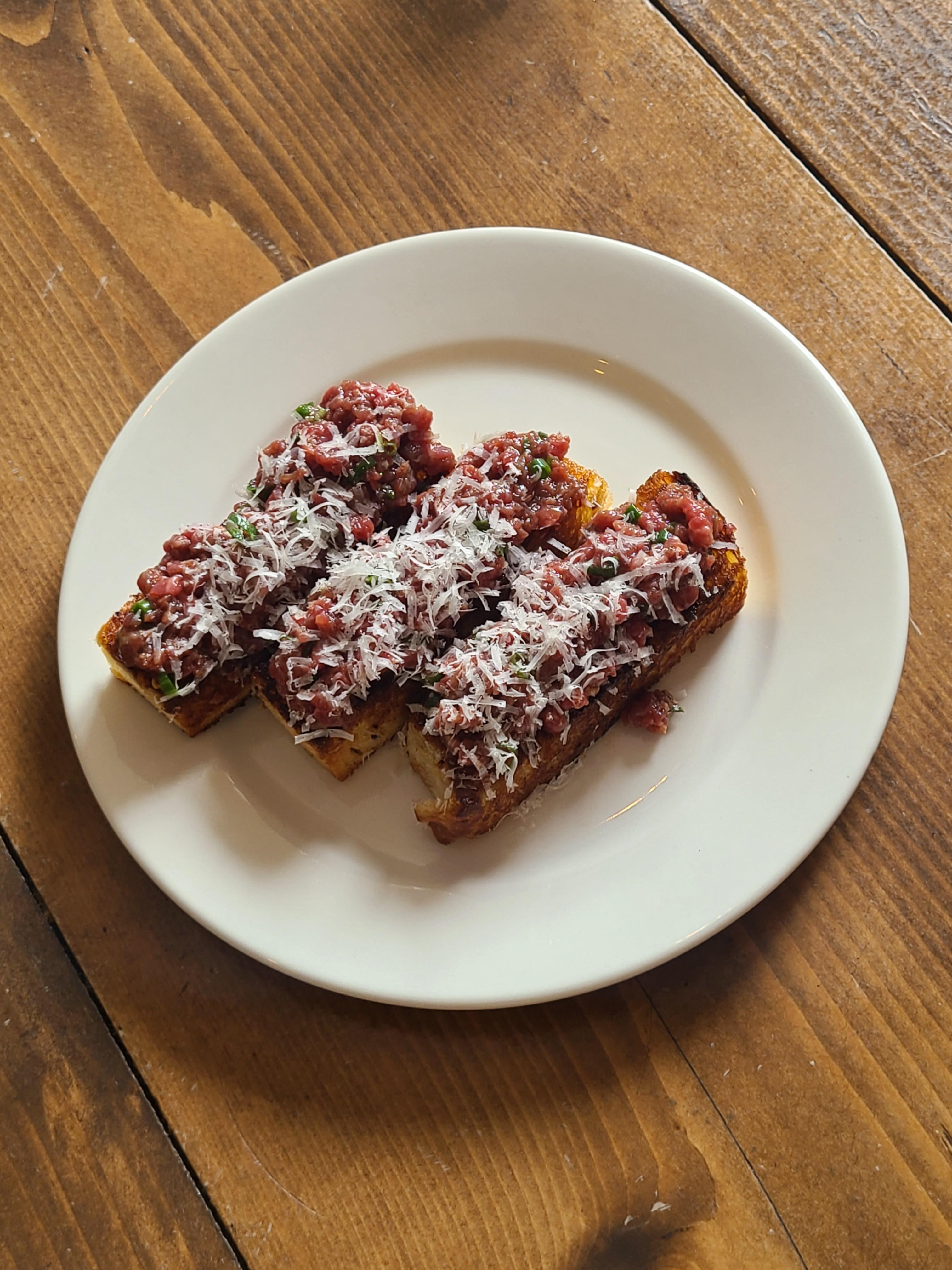 빵에 한우가 올라가고 유자 소스가 곁들어진 사이드 메뉴이다.
