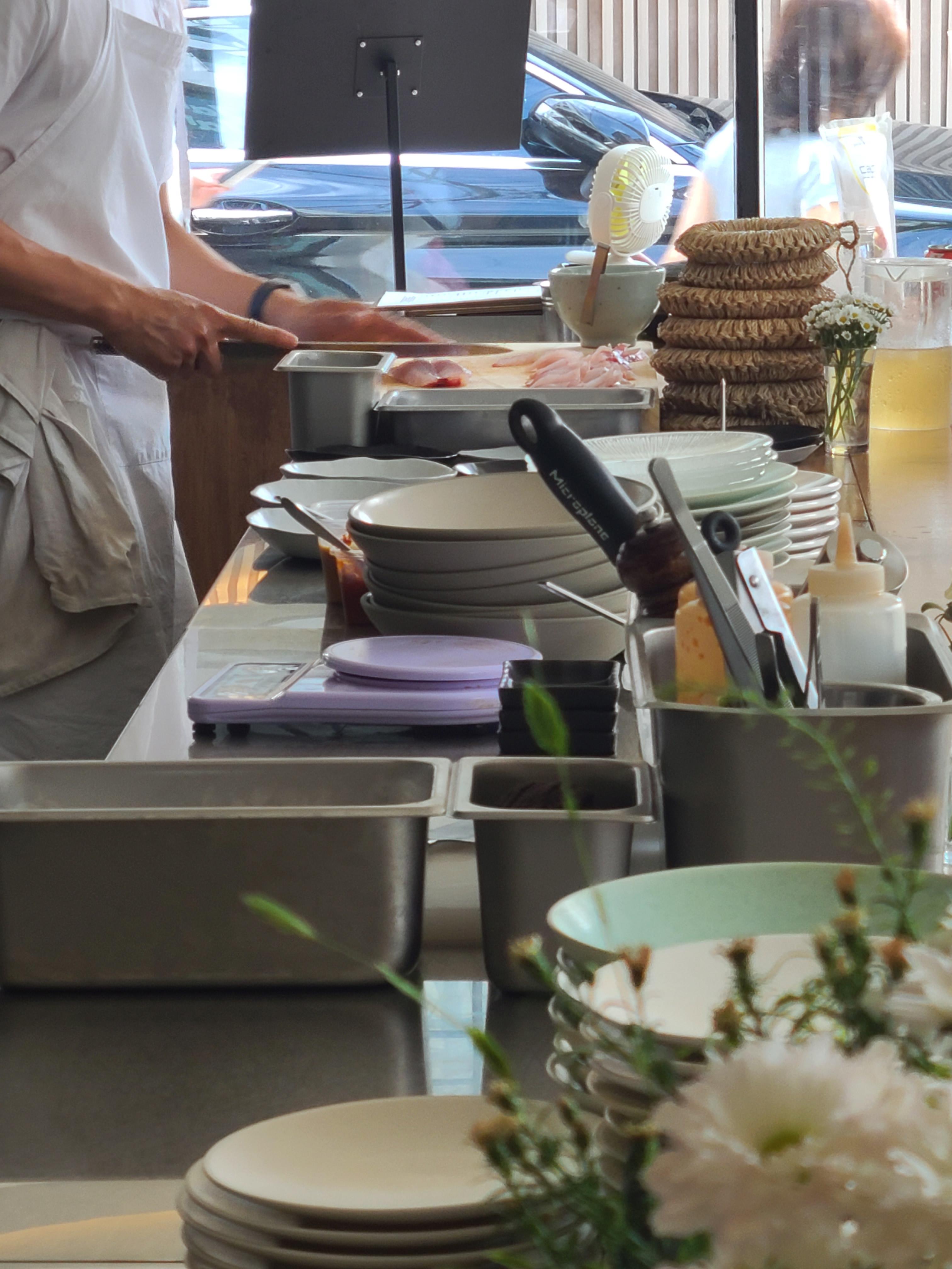 3명으로 예약한 우리는 테이블 맨 끝자리로 배정 받았다. 예약한 시간이나 인원수에 따라 자리를 사전 배치하시는 듯했다. 맨 끝자리라 요리하는 모습이 거의 안 보이는 점은 아쉬웠다.ㅠ