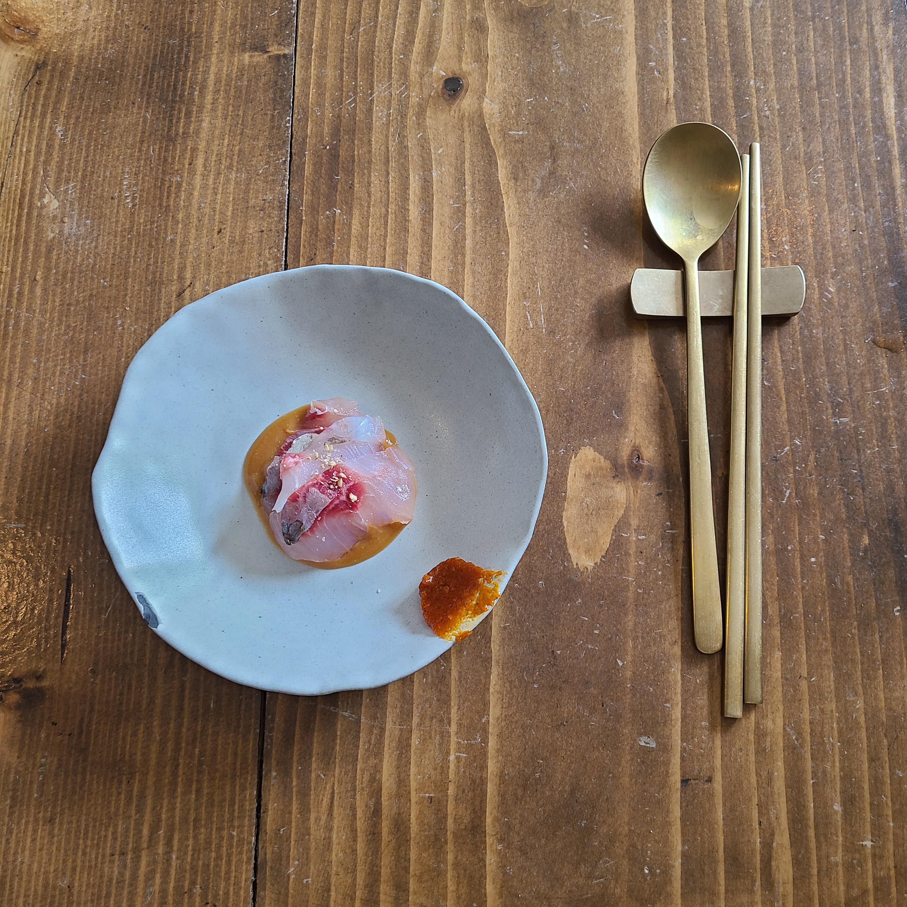 사시미로는 보리숭어가 나왔다. 아래 겨자소스가 깔려있고 옆에 쌈장이 같이 나온다. 위에 깨소금이 뿌려져있어 짭짤한 느낌이 난다.